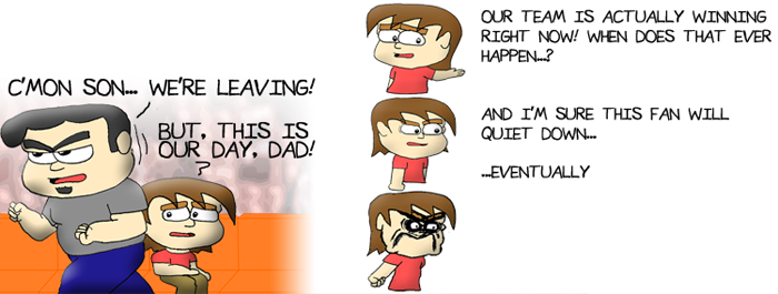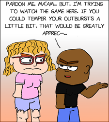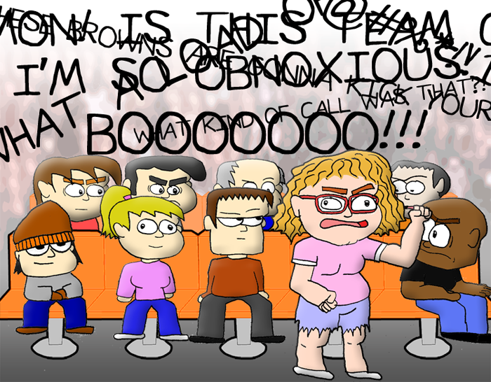 This type of behavior might be on the lower-end of acceptable if you're sitting front row in the infamous 'Dawg Pound', but we were nowhere close to it; We were situated in the nose-bleed section on the upper-level mezzanine. Don't get me wrong -- celebrating, shouting toward the field, or periodically teasing a fan of the opposite team is what fans are supposed to do... but only when a reason presents itself. But there was no rhyme or reason to her outbursts. There was no peace to be found in our section. She had complete disregard for everyone around her. This woman had the complete inability to grasp the fact that everything she was doing had zero effect on the outcome of the game, but she was convinced that she was. And she was going to keep doing it no matter what. I've witnessed at least two fans kindly suggesting her to take things down a notch, only for her to bust out in a verbal rampage that would've made even Satan blush.